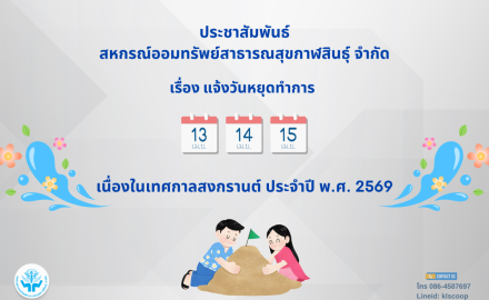 ประการ เรื่อง แจ้งวันหยุดทำการสหกรณ์ เทศกาลสงกรานต์ ประจำปี พ.ศ. 2569 (วันที่ 13-15 เมษายน 2569)