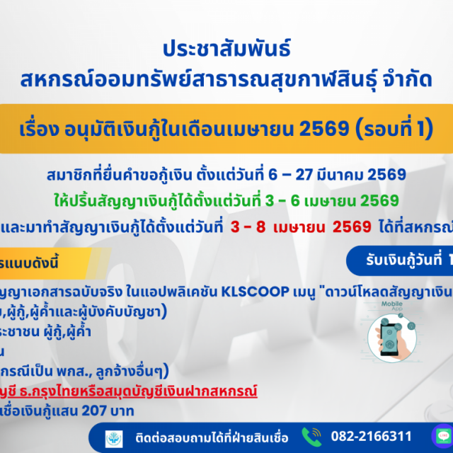 ประกาศ เรื่อง รับอนุุมัติเงินกู้ในเดือนเมษายน 2569 (รอบที่ 1)